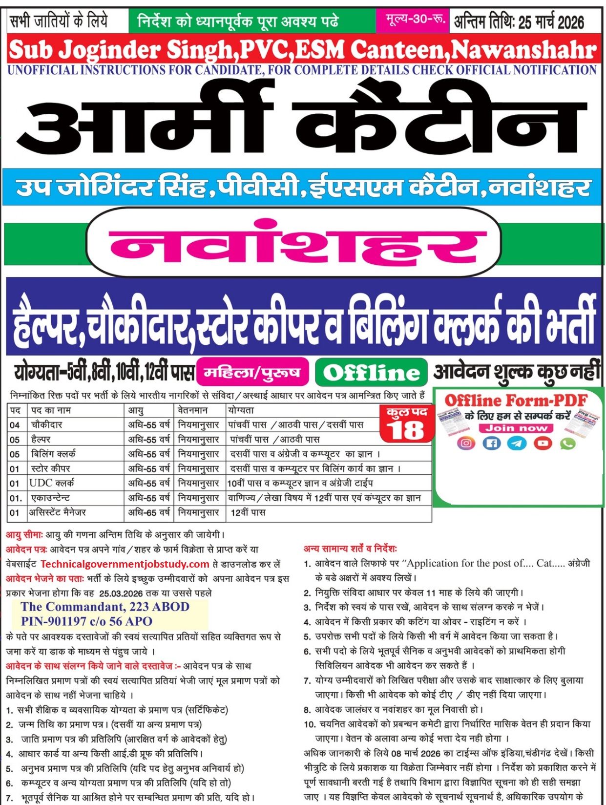 हेलो दोस्तों, 2026 में Sub Jogindar Sign, PVC, ESM Canteen Nawanshahar में एक असाधारण भर्ती निकली है भारत के सभी लोग इसके लिए आवेदन कर सकते हैं पुरुष और महिला दोनों के लिए यह बहुत अच्छा मौका है आवेदन कैसे करें इसमें आपको कितनी सैलरी मिलेगी और इसमें आपकी आयु सीमा क्या है इच्छुक उम्मीदवार फॉर्म भरने से पहले पूरा नोटिफिकेशन जरूर पढ़ें फॉर्म कैसे भरना है इसकी पूरी जानकारी आपको यहां मिल जाएगी आपको बता दें कि अगर आप Army Canteen में नौकरी करना चाहते हैं तो आपके लिए बहुत अच्छा मौका आया है जो लोग 2026 में Government Job करना चाहते हैं उनके लिए बहुत अच्छा मौका है भारत के सभी राज्यों के लिए भर्ती निकली है आप अपने ही राज्य में नियुक्त हो सकते हैं
